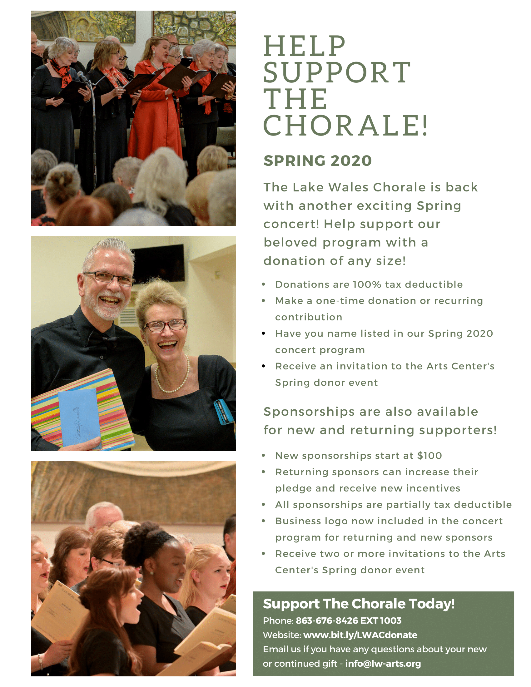***All one-time gifts and pledges are due by March 22nd. Checks are made payable to Lake Wales Arts Council, inc. with the memo line as Chorale Spring Concert (specify either donation or sponsorship).